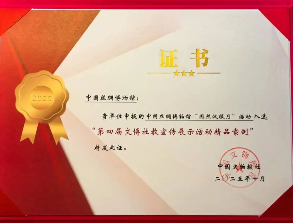 10月29日,由中华文物交流协会指导、中国文物报社主办,殷墟博物馆承办的第四届文博社教案例宣传展示活动终选会在河南安阳举办。中国丝绸博物馆“国丝汉服月”活动荣获“第四届文博社教宣传展示活动精品案例”。
