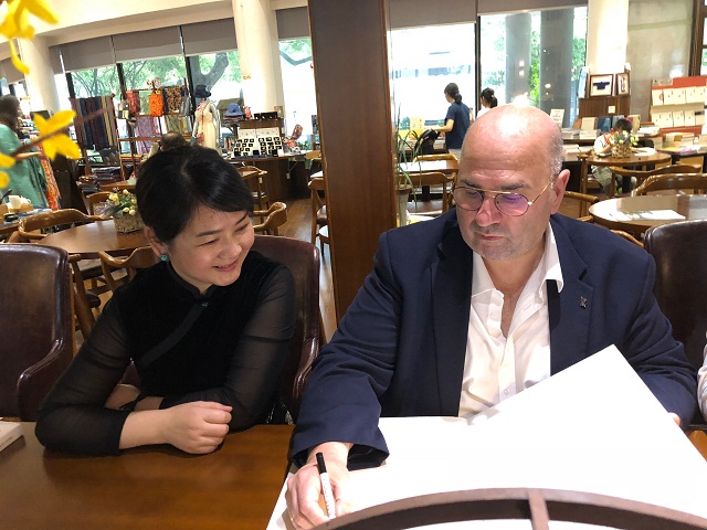 参观之后双方在锦廊进行了座谈,我馆向法比奥·布依先生赠送了《中国养蚕法:在湖州的实践与观察》一书,其原著为意大利乔凡·巴蒂斯塔·卡斯特拉尼教授, 2016年,由我馆与意大利帕多瓦大学合作翻译完成中英文。19世纪中叶,在欧洲肆虐十数年之久的蚕微粒子病,以摧枯拉朽之势重创意大利的丝绸生产,使其在地中海地区的霸主地位一去不返。为了寻找健康的蚕种,探索对抗蚕病的科学方法,意大利蚕桑专家卡斯特拉尼率领一支由7人组成的科考、商业探险队于1859年来到中国,在浙江湖州逗留近两个月,对该地区的养蚕法进行较为深入的研究,并进行养蚕比较实验,这些笔记构成了此书。这是反映湖州丝绸历史的重要见证,是中国丝绸历史的珍贵图像,更是中国意大利在近代丝绸科技文化交流的灿烂一页。