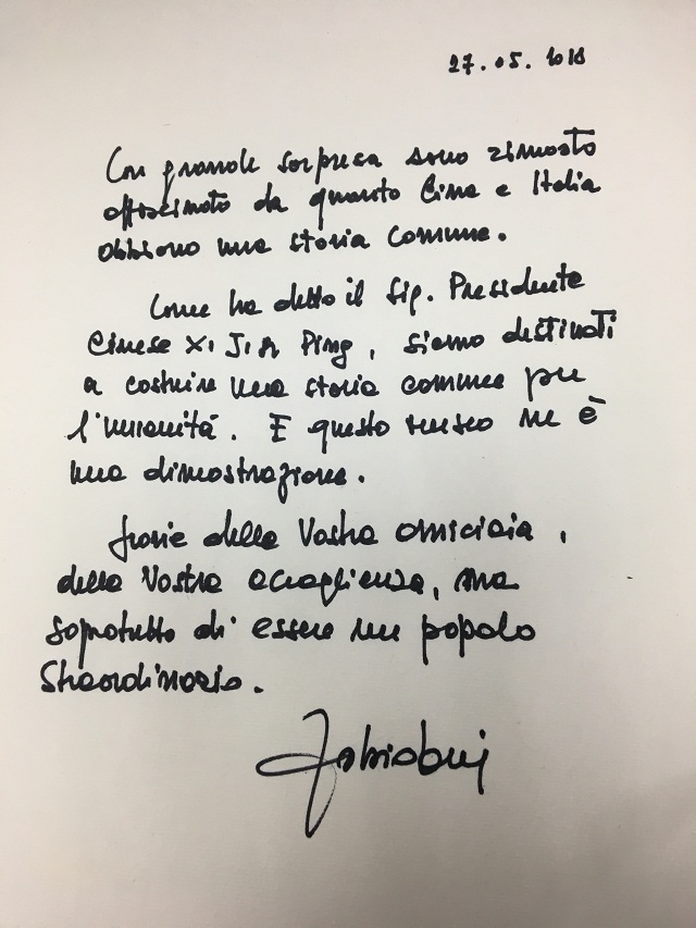 最后,法比奥·布依先生为我馆题字:中国习主席提出“共建人类共同体”,我们应该加强合作,中国丝绸博物馆就是践行了习主席的倡议,感谢你们的友谊,感谢你们的友好接待。