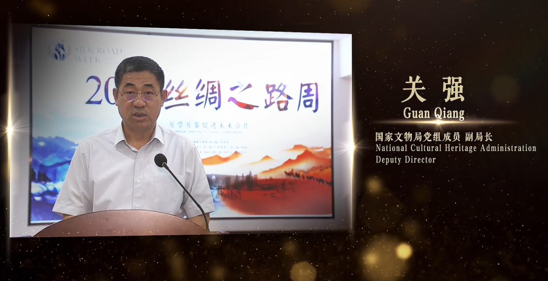 国家文物局党组成员、副局长关强通过视频连线发表致辞:在实现“两个一百年”奋斗目标的历史交汇之际,“一带一路”国际人文交流正当其势、大有可为。在当前国际社会团结合作、携手抗疫的大背景下,传播、弘扬丝路精神,举办首届“丝绸之路周”活动,具有特别深远的现实意义,“丝绸之路周”将成为东西方对话协商和友好合作的创新典范。
