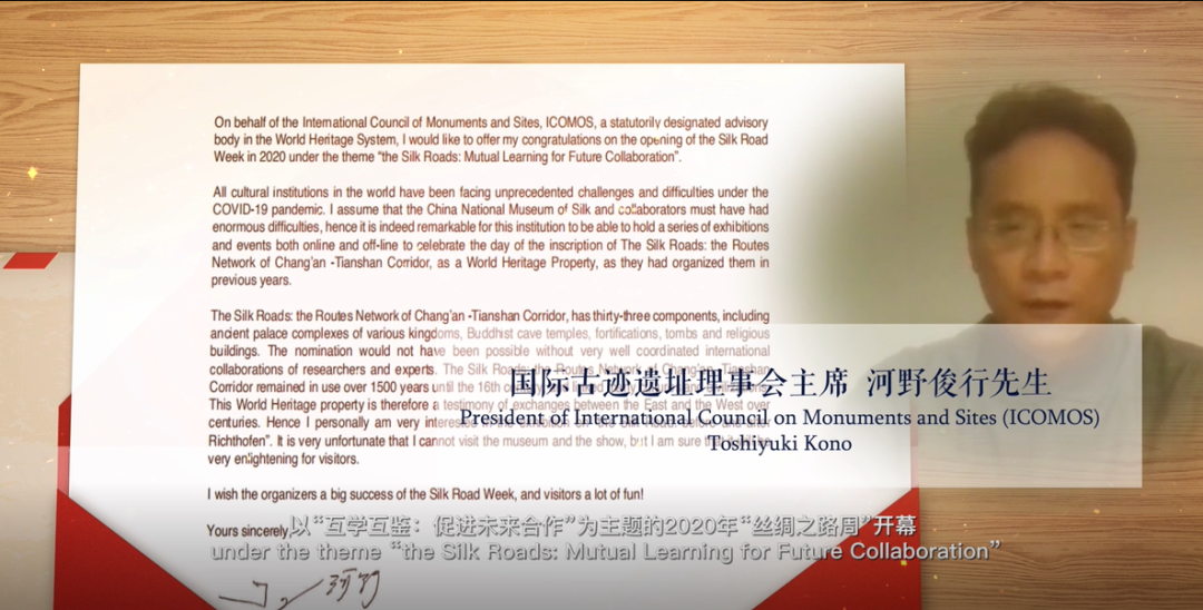 联合国教科文组织世界遗产中心主任梅希蒂尔德·罗斯勒自巴黎总部发来贺辞,认可“互学互鉴促进未来合作”的主题,称其高度切合1972年《世界遗产公约》精神,丝路精神值得发扬光大。同时强调“丝绸之路”不仅体现互学互鉴精神,还将作为世界文化遗产成为未来国际合作的共同基础和起点,为人类构筑心灵的和平屏障。