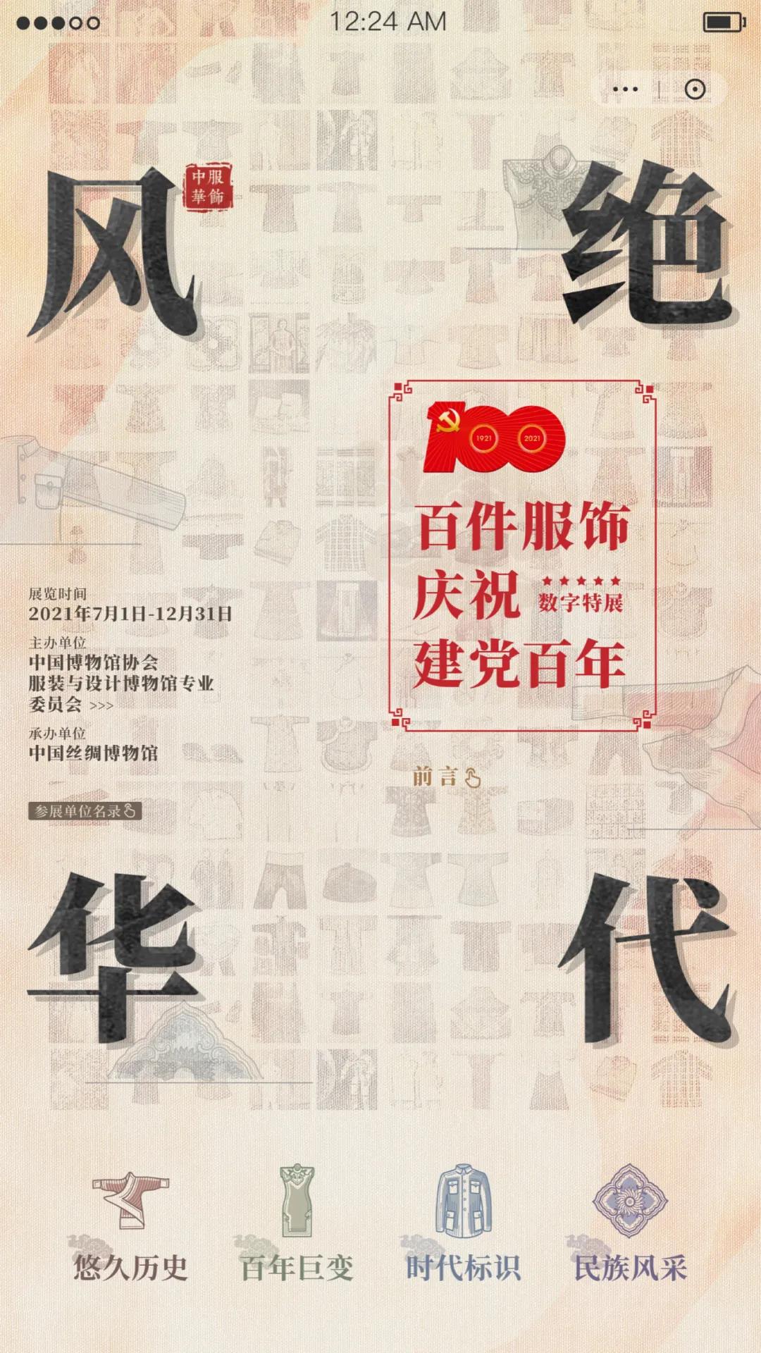 为庆祝中国共产党成立100周年,中国博协服装与设计博物馆专委会从全国50余家团体会员博物馆中遴选了百余件服饰藏品,从“悠久历史”“百年巨变”“时代标识”“民族风采”四个部分,以虚拟数字展览形式,举办此次“绝代风华:百件服饰庆祝建党百年数字特展”。旨在通过这次展览,梳理中华传统服饰文化更迭发展的源流与韵味,同时也向世人传播中华上下五千年服饰文化的故事与魅力。