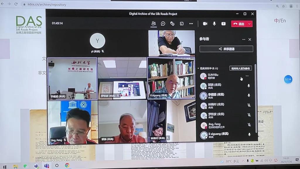 2021年7月20日下午,中国丝绸博物馆组织邀请相关考察亲历者和专家,联合国教科文组织世界遗产中心亚太部主任景峰、西北大学教授李建超、中国文化遗产研究院研究员郭旃、清华大学教授李希光、北京大学教授林梅村、泉州海外交通史博物馆馆长丁毓玲参加“联合国教科文组织丝绸之路项目三十一周年纪念会暨丝绸之路项目数字档案网开通”的网络视频会议。此次会议是在上一年同一天的三十周年纪念会基础上根据建立丝绸之路项目数字档案(DAS: Digital Archive of the Silk Roads Project)的倡议而召开。