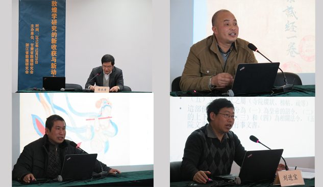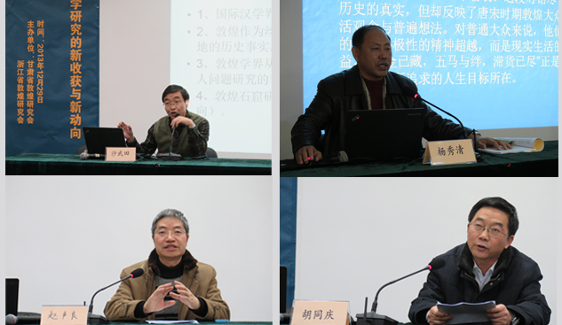 会上,来自甘肃省敦煌研究会和浙江省敦煌研究会的7位专家学者作了报告。甘肃省敦煌研究会赵声良作的“近年来敦煌艺术研究”,结合佛教史背景特别是佛教仪轨对敦煌石窟艺术进行了深入的探讨;甘肃省敦煌研究会胡同庆作的“具象、实用——敦煌美学研究的发展方向”对敦煌整体艺术、壁画、服饰、乐舞、文学、书法等众多方面介绍了敦煌艺术研究近年来的状况;甘肃省敦煌研究会沙武田作的“敦煌石窟粟特美术研究”,对粟特研究作了简要的介绍,并结合学界研究成果对敦煌洞窟中的粟特供养人作了研究;甘肃省敦煌研究会杨秀清作的“中古时期大众思想史研究的几个问题——以唐宋敦煌地区为中心”,以敦煌文书为中心对唐宋时期敦煌地区的大众思想作了概述;浙江省敦煌研究会刘进宝作的“敦煌史部文献整理研究”,对正在进行的《敦煌史部文献合集》编纂工作作了详细的介绍;浙江省敦煌研究会毛建波作的“中国美术学院龟兹壁画临摹研究计划”,则针对中国美术学院的龟兹壁画临摹研究计划作了介绍;浙江省敦煌研究会朱大星所作的“敦煌道经略论”,则以敦煌文书为中心,详细介绍了敦煌当地的道教经典,深化了对敦煌地区宗教多样化的认识。