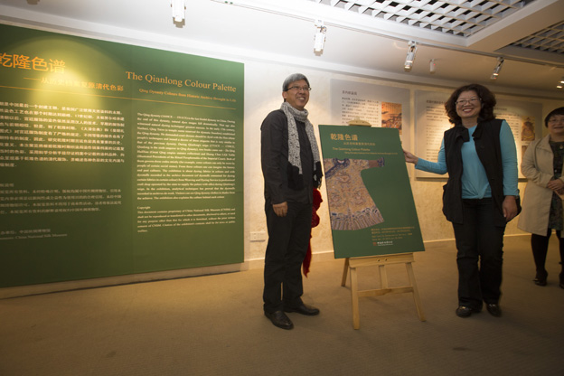 为了宣传中华民族在纺织印染技艺上的创新精神,鼓励文博工作者、传统文化爱好者、印染行业专家等继承并革新天然染色技术,应用于绿色环保事业,4月18日,中国丝绸博物馆举办的“乾隆色谱——从历史档案复原清代色彩”展览在丝博的纺织品文物修复展示馆开幕。开幕式由支部副书记、馆长助理蔡琴主持,赵丰馆长和北京石刻艺术博物馆馆长王丹为展览揭幕。馆长赵丰在致辞时说到:“乾隆王朝是一个富裕的时代,一个值得想象和怀念的时代;同时又是一个机巧的时代和一个华丽的时代,这样,经济基础、科技基础和艺术基础都有了,正是我们为什么要选择复原乾隆时代的色彩来复原并展示的原因……乾隆色谱是一个活的色谱,真实的色谱,可以被复原出来;它又具有真实性,因为有比较完整的史料记载可供核实;最后,希望通过这个工作,打通陈列与研究、分析与工艺、古代与今天、人文和自然科学之间的联系。”