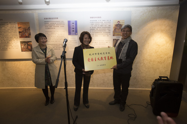 同时杭州紫荆花学校将我馆定为爱国主义教育基地的授牌仪式也在此举行。紫荆花学校的党支部书记郑老师在授牌时致辞,其中提到该校将中国丝绸博物馆定为爱国主义教育基地是一个非常慎重的选择和决定,中国丝绸博物馆很重视学生教育,在这方面作出了巨大的努力,是一个非常有责任心的博物馆。
