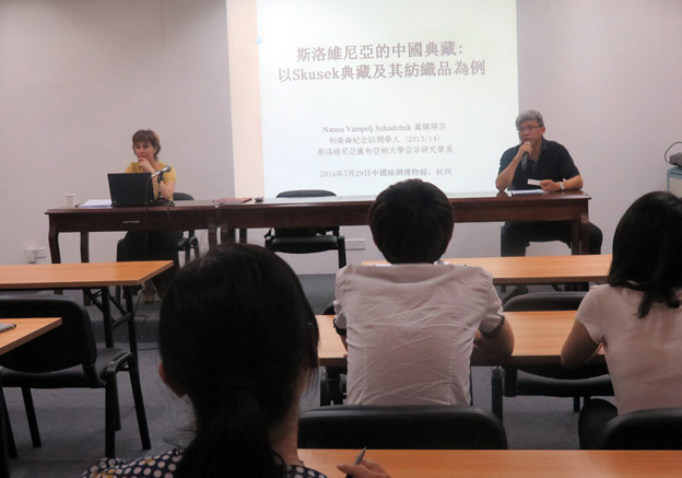 7月29日下午,来自斯洛文尼亚卢布尔雅那大学亚非研究学系的万娜塔沙博士在我馆讲授了题为“斯洛文尼亚的中国典藏:以Skušek典藏及其纺织品为例”的讲座。讲座由赵丰馆长主持,听众主要为我馆的专业技术人员。