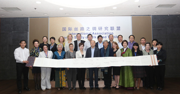 开幕式还有一个重要的部分就是国际丝路之绸研究联盟(International Association for the Study of Silk Road Textiles,以下简称“联盟”)成立的签约仪式。联盟旨在通过联合丝绸之路沿途或相关的研究机构(包括大学、博物馆、图书馆、考古所、研究机构、研究团体等)进行合作而成立的国际性联盟,进行合作研究、资源共享。首次作为创立者的20家机构是: