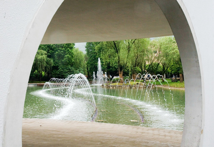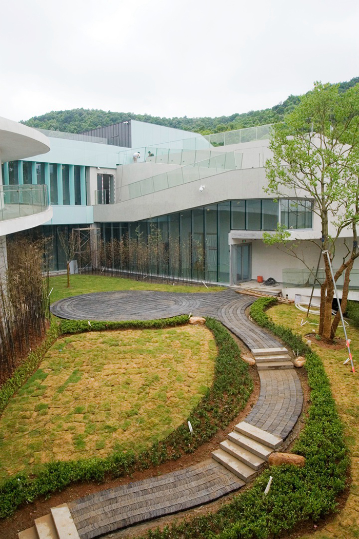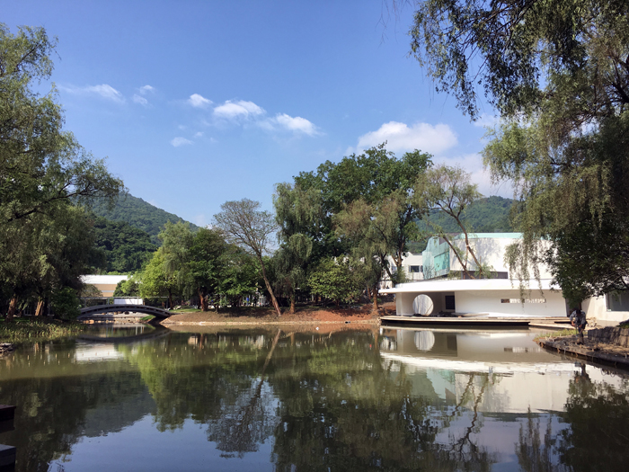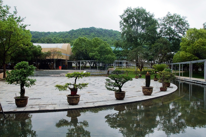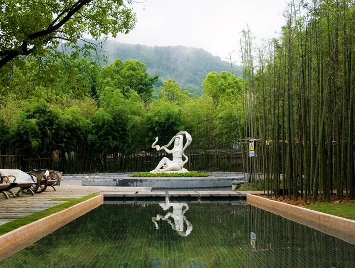 在原来的织造厅和修复馆两侧有两片溪水环绕的空地,嫘祖像背靠青山竹林,继续静默的守望中丝博,守望着新建成的时装馆。