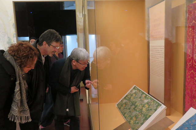 Michiele Bugliesii教授一行在讲解员带领下参观了丝路馆、织造馆、修复展示馆和时装馆,赵丰馆长全程陪同。Michiele Bugliesii教授对我馆新颖的陈列,丰富的馆藏以及修复的专业性赞叹不已,对中国传统织造技术表现出浓厚的兴趣。