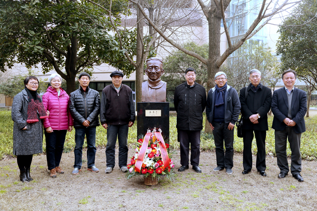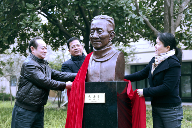 朱老与中国丝绸博物馆有很深的渊源,在杭州建造中国丝绸博物馆是朱老晚年朝思梦想的夙愿,并多次向各个相关部门提议;在丝绸博物馆前加“中国”也是朱老力争;最终确定选址也得到朱老的认可。朱老的这个愿望早已实现,我馆在去年的改扩建时特在馆区内为他塑像立碑。作为开馆25周年馆庆活动之一,2月24日上午我馆举行了简短的朱新予铜像揭幕仪式。参加揭幕仪式的有浙江省文物局副局长曹鸿、浙江理工大学副校长陈建勇、丝绸博物馆的历任馆长、朱新予的家属代表等。揭幕仪式由馆长助理蔡琴主持,赵丰馆长讲话,省文物局副局长曹鸿、理工大学副校长陈建勇和朱新予亲属代表朱维冈为铜像揭幕。