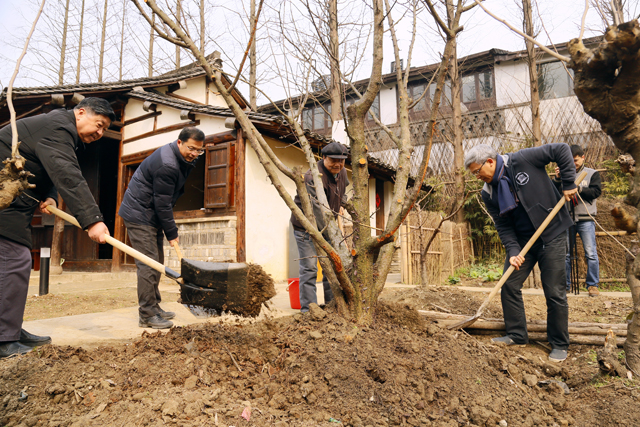 中丝博在一年的改扩建中对馆区的园林绿化进行重新规划布局,面貌焕然一新,为增加树木品种,杭州良渚遗址管理区管委会向我馆捐赠11棵果树,其中有桃、石榴、橘、李等,今天这11棵树木已落户在丝博的馆区内,不久的将来果树将结出累累的果实,成为丝博的一景。博物馆的历任馆长以及博物馆的职工参加了植树纪念活动。