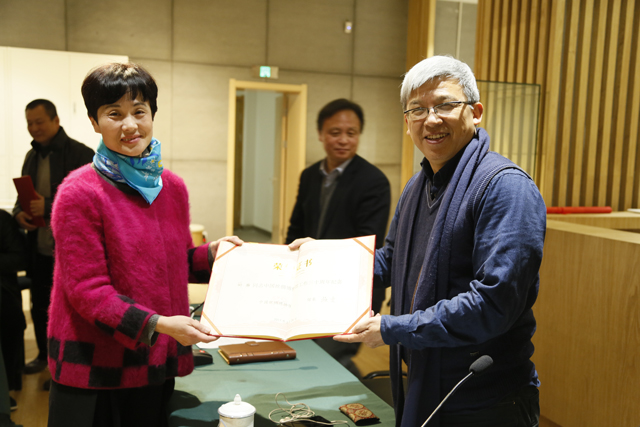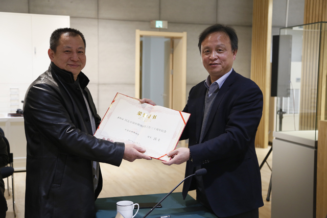 开馆25周年座谈会于24日上午10点在新猷资料馆举行。历任主要馆领导、退休职工和在职员工参加了座谈会。座谈会由馆长助理张毅主持,赵丰、蔡琴、张毅三位现任馆领导向中国丝绸博物馆30年从业人员楼婷、薛雁、王树庄颁发荣誉证书。在座谈交流环节,首先由30年从业人员楼婷、薛雁、王树庄谈感想;博物馆的老领导凌人才、傅传仁、徐德明、俞志达、何荣花等回顾了建馆历程,他们对丝博今天取得的成就表示赞赏,对自己作为一名丝博人而感到自豪。并希望全馆员工坚持发扬丝博优良传统,继续拼搏,丝博的明天将会更美好。最后由赵丰馆长作了总结性发言,他对前辈为丝博付出的心血和汗水表示由衷感谢,对与丝博共同成长的员工提出期望,希望他们在前辈努力的基础上,将丝博建设得更美好,他更对年轻的专业技术人员寄予厚望,希望他们勇挑重担,开创丝博美好的未来。座谈会结束后大家在锦绣广场合影留念。