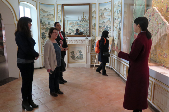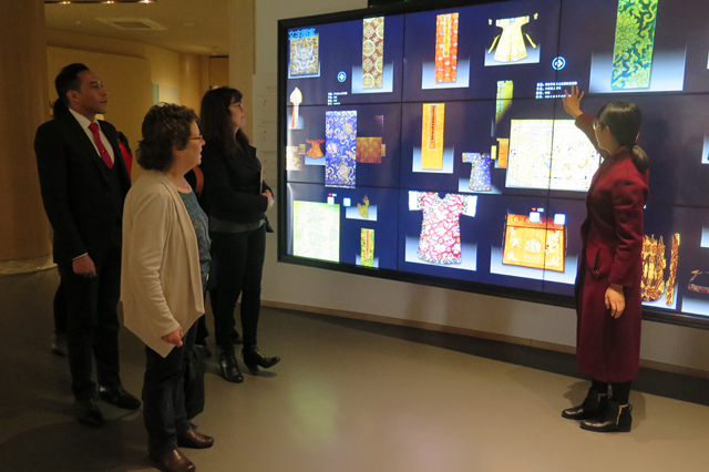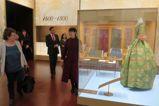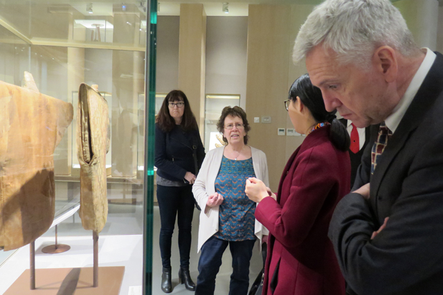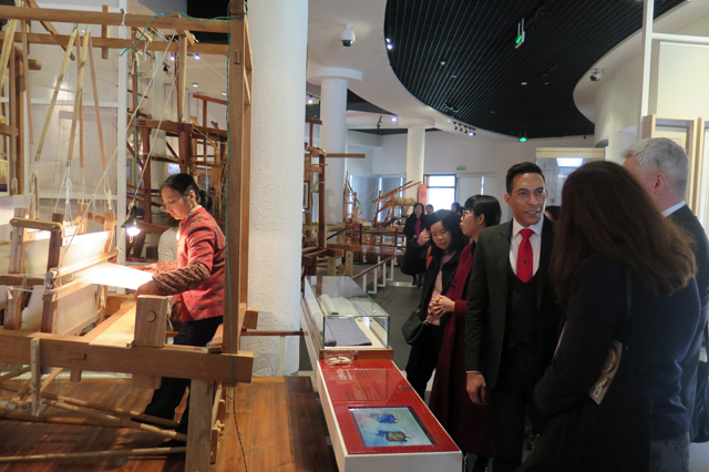 跟随中国丝绸博物馆专业讲解员的导览,利兹市议会议长Judith Blake一行参观了丝路馆、织造馆、修复馆和时装馆。织造馆的古代织机操作演示、修复馆工作人员的织物修复技艺以及中国时装馆的旗袍都给几位远道而来的客人留下了深刻的印象。