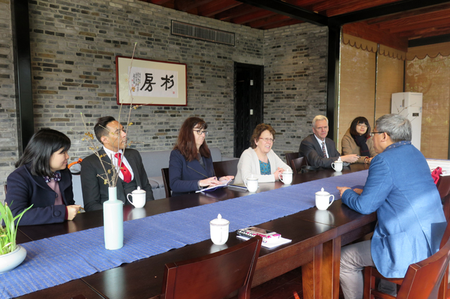 3月1日,英国利兹市议会议长JudithBlake、利兹国际关系部项目负责人Karen Murgatroyd、利兹大学艺术系教导主任Frank Finlay和利兹艺术大学高等教育研究学院主任Randall Whittaker在杭州市人民政府外事办公室工作人员陪同下,来到中国丝绸博物馆参观并商谈相关合作事宜。