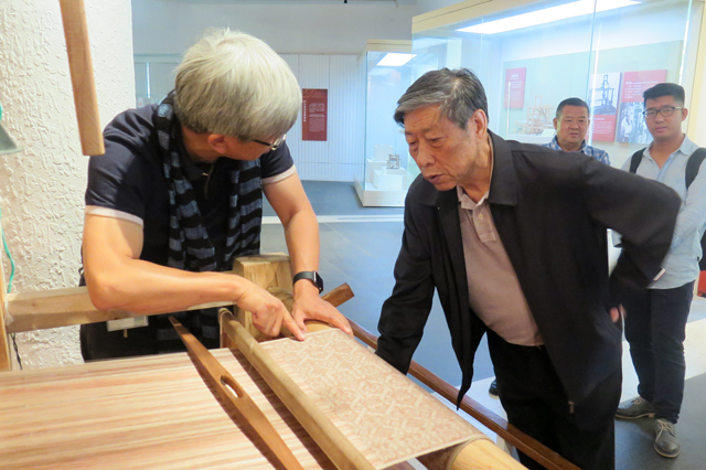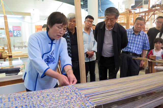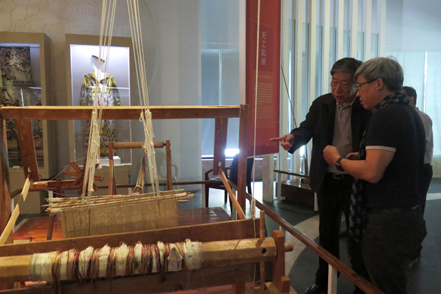 赵丰馆长首先向迟万春副主任一行介绍丝路馆“锦程——中国丝绸和丝绸之路”展览设计的策展思路体现了“一路一带”理念的历史根源,并为来宾详细讲解了博物馆的基本陈列展示内容。在参观过程中针对迟副主任委员提出他在工作中遇到的中外丝绸生产技术方面的疑问,赵丰馆长结合展览中的相关展示进行了生动的解答,如在丝路馆用像锦织物介绍西方贾卡织机的发明对现代纺织工业乃至计算机发明的作用,意匠图在织物设计过程中的重要性;在织造馆通过多台织机的演示介绍传统织机是如何设计提花装置和丝线穿过综扣的工艺过程。