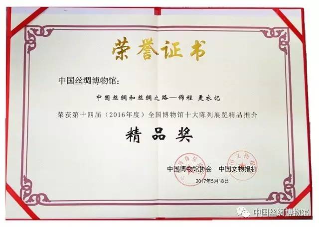 由中国博物馆协会、中国文物报社主办的第十四届(2016年度)全国博物馆十大陈列展览推介终评会于2017年5月16日在北京中国职工之家举行,并于18日上午在“5﹒18国际博物馆日”中国主会场——首都博物馆举行了颁奖典礼。中国丝绸博物馆“中国丝绸和丝绸之路——锦程、更衣记”经过激烈的角逐,脱颖而出,荣获全国十大陈列展览精品奖,这是继中国丝绸博物馆2006年之后第二次获得中国博物馆陈列的最高荣誉。