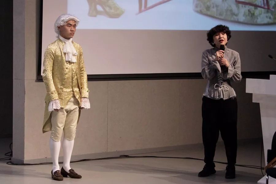 高耸的假发发型、羽毛帽子、精致的折扇;女装的紧身胸衣、宽阔的拱形裙型、数不清的绸带、花边、褶皱的装饰、精美的刺绣……观众们通过欣赏《绝代艳后》片段,从精致的服饰中感受到了一览无余的洛可可风格。