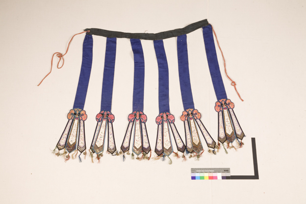 描述:这是一条系于裙外起装饰作用的裙带。整个裙带由六条蓝色条带连缀于腰头上,每条蓝带的末端各缀三条短带,尾端均裁成尖角成凤尾形,中间一条较宽,两侧较窄。上下两部分连缀处有红色镶黑边蝙蝠形状的装饰。每条短带中间都是白色缎地彩绣花卉,下缀铃铛。