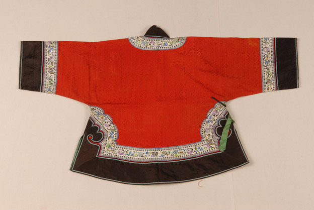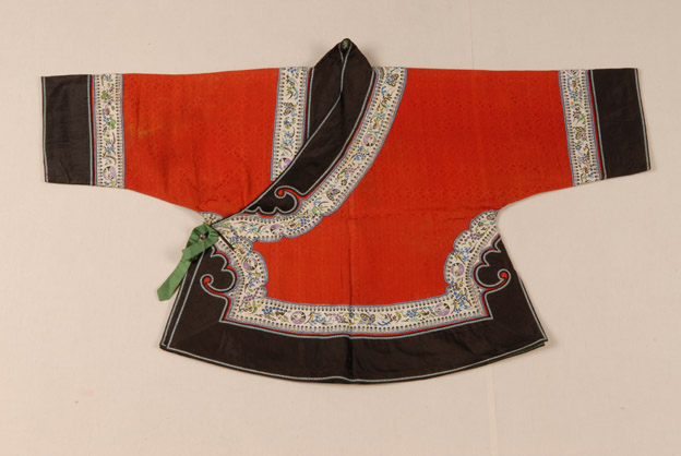 描述:该童褂,交领、右衽,两端开衩。主要面料为大红柿蒂小花绸料,领缘和下摆边刺绣镶滚。这是清代典型的注重边饰的褂,连童装也不例外。