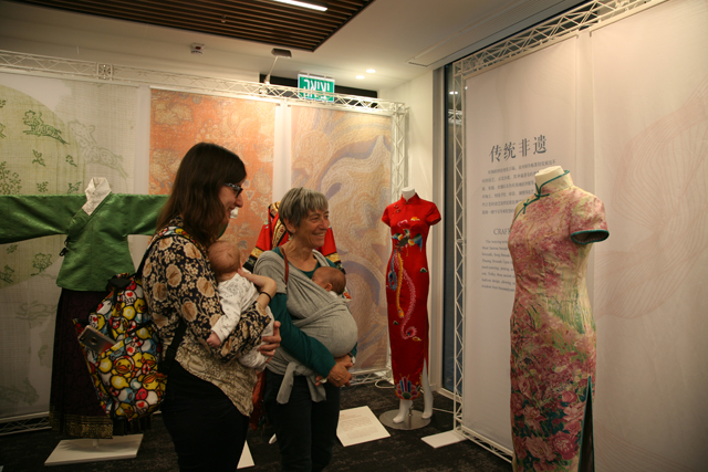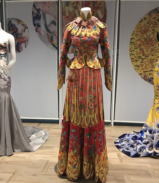 在传统非遗部分,观众目睹丝织技艺的变化万千,云锦、蜀锦、宋锦、壮锦以及各民族地区织锦,通过手绘、印染、刺绣等技艺,绽放在现代的服装设计里,使以色列观众一睹了千百年来中国智慧的结晶。展览中的中式嫁衣¬——“云肩翘摆凤尾裙”极博眼球,采用双层柳叶式云肩,翘摆的灵感来源于中国古代建筑,其设计师郭培是中国第一代服装设计师,也是中国最早的高级定制服装设计师,入选了《时代周刊》公布的2016年度“全球最具影响力人物”。