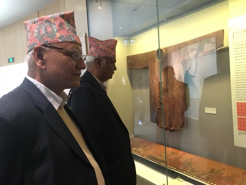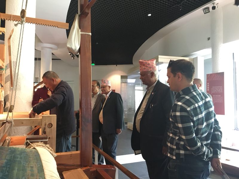 尼泊尔地处南亚丝路,近年来屡有纺织品出土,其纤维和染料与同时期的印度、中国西藏和新疆出土的纺织品有共通之处。参观结束后,中国丝绸博物馆馆长助理周旸向尼泊尔学院院长耿伽•普拉萨德•乌普莱赠送《丝路之绸》英文版,对方向中国丝绸博物馆赠送3件尼泊尔传统手工织造纺织品。