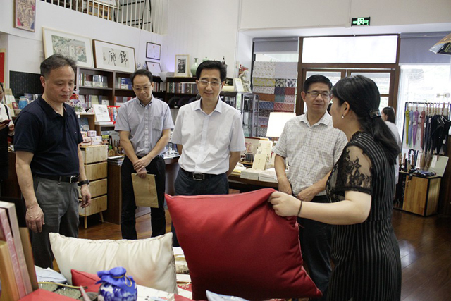 在锦绣廊,考察团一行还驻足欣赏了国丝馆精美的文创产品,党总支书记、副馆长张毅与馆长助理周旸针对产品设计与思路作了细致的解读。