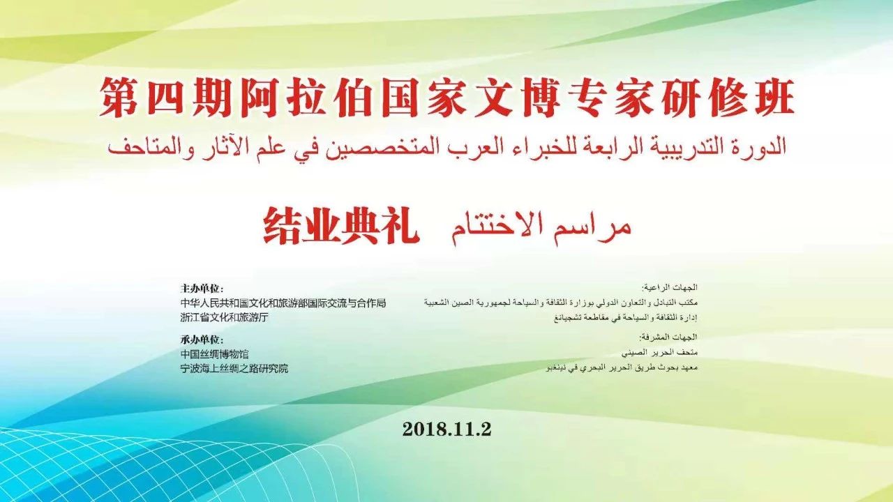 2018年11月2日,2018年度第四期阿拉伯国家文博专家研修班结业仪式在北京首都博物馆举行。文化和旅游部国际交流与合作局西亚北非处处长李千国、副处长张易、首都博物馆馆长韩战明、宁波海上丝绸之路研究院副院长徐侠民、参与本期研修班的阿拉伯国家学员以及志愿者团队出席了结业仪式。