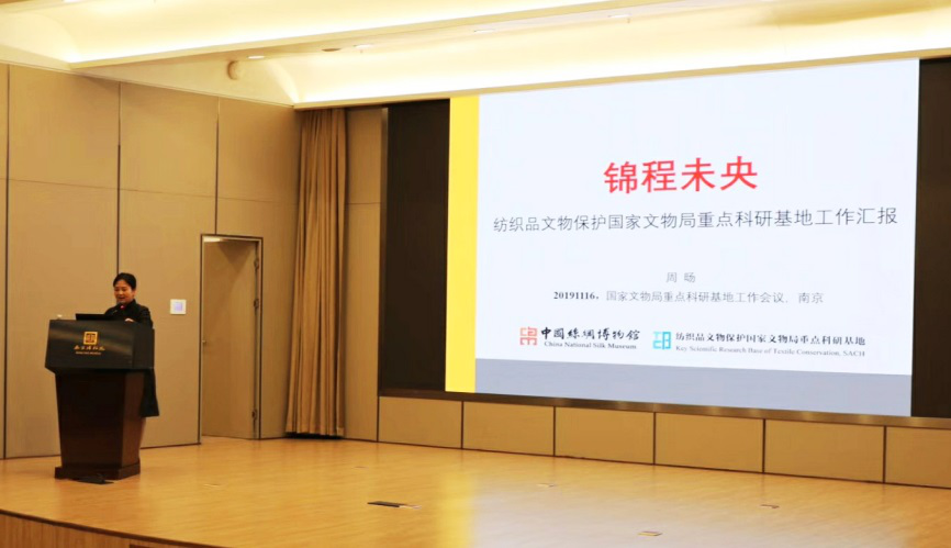 2019年11月16日,国家文物局重点科研基地会议在南京召开。本次会议由纸质文物保护国家文物局重点科研基地(南京博物院)承办,国家文物局副局长关强,国家文物局博物馆与社会文物司(科技司)司长罗静,国家文物局博物馆与社会文物司(科技司)副司长邓超,江苏省文化和旅游厅党组成员、副厅长、南京博物院院长龚良等出席会议。全国33家科研基地负责人及相关省市文物局负责人近50人到会,浙江省文物局副局长曹鸿率纺织品文物保护国家文物局重点科研基地(中国丝绸博物馆)主任周旸、技术部副主任王淑娟参加会议。