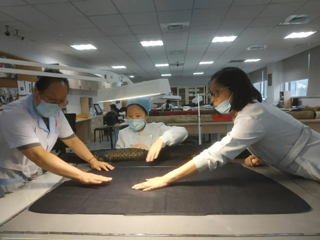 修复基于对文物的全面科学认知与病害调查。通过纤维材质、织物组织、金属线成分进行检测分析,对服装形制进行研究复原,并结合保存状况评价,确定文物修复的技术路线。采用低氧消毒、局部清洁、针线缝合加固等保护修复技术手段,选择定制的绉丝纱、真丝绡等作为修复材料,对10件文物进行了修复,使之在强度和柔韧度上得到改善,同时满足陈列需求。