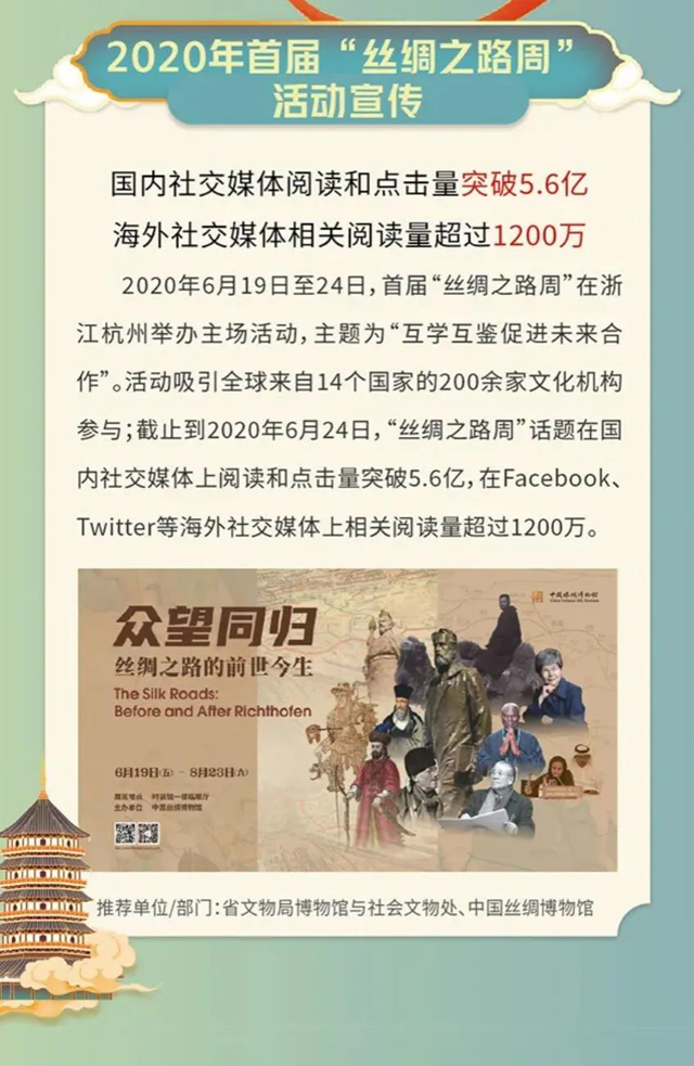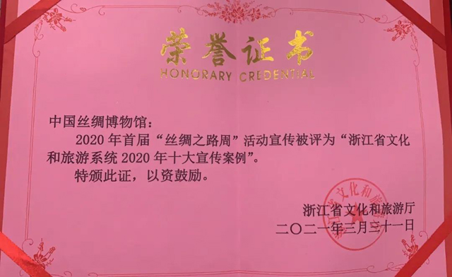 日前,浙江省文化和旅游厅公布“浙江省文化和旅游系统2020年十大优秀宣传案例”,中国丝绸博物馆“2020丝绸之路周”活动宣传入选。