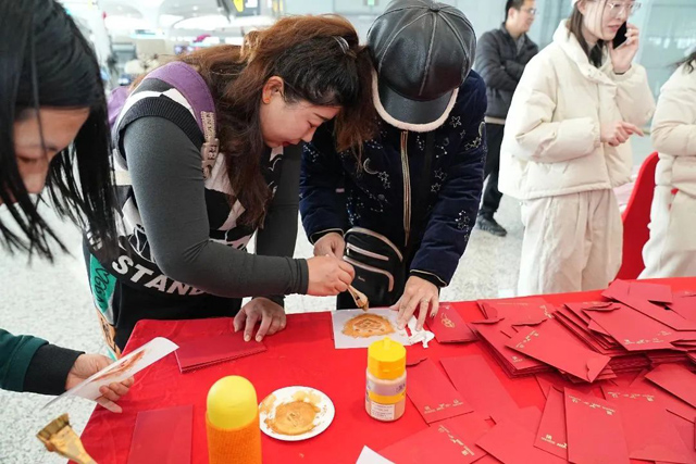 此外,国丝馆还推出了“把吉祥中国带回家”现场互动体验环节。从本次展览的展品中选取了中国传统纹样中的吉祥纹样,并将纹样制作成镂空拓版,旅客们只需要花1分钟的时间就可以把自己喜欢的纹样拓印到红包上,装进口袋里,将这一份中国式浪漫带回家分享给亲人、朋友和爱人。