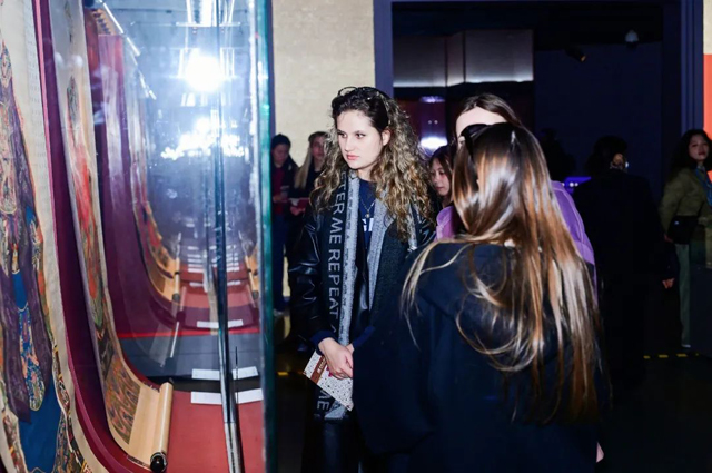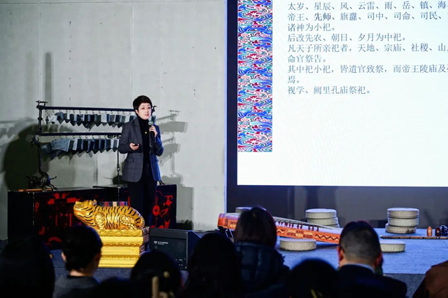 开幕式当晚,国丝还举办了“礼乐之夜”活动。孔子博物馆旧藏服饰研究中心主任徐冉带来《齐明盛服以承祭祀》主题分享,通过对明代衍圣公祭服的解读,剖析明代服饰在礼仪文化中的重要作用。孔子博物馆典藏部主任褚红轩为观众带来了《毕诚毕敬-谈孔子博物馆藏清代兽面纹掐丝珐琅五供》主题分享,让观众对“五供”的历史源流与特点有更深入的了解。