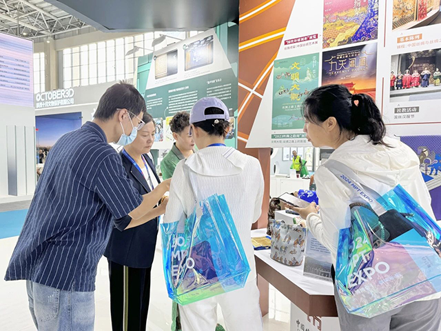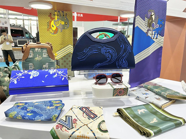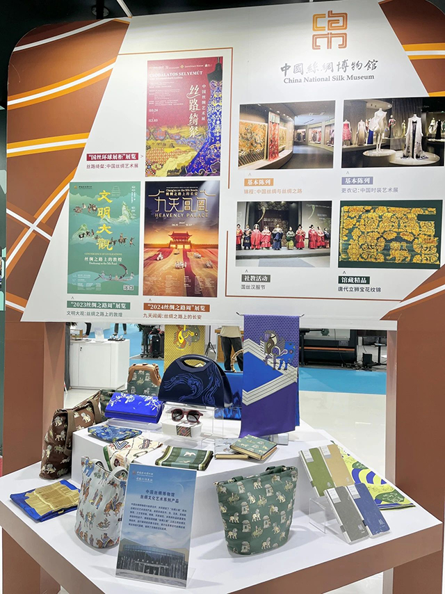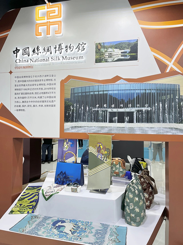 本次博博会,中国丝绸博物馆带来了与各界合作,共同研发的“丝绸之路”原创丝绸文化艺术系列产品20余款,品类涵盖丝巾、包、文具及其他配饰,包括丝绸之路周系列文创产品、锦绣国丝三十年系列文创产品、与敦煌研究院、浙江省自然博物院推出的联名丝巾等,深受现场观众喜爱。此次展出的文创产品,是国丝根据馆藏“丝绸之路”上出土的丝绸文物纹样,运用织锦、刺绣、天然染色等工艺,设计出的具有传统丝绸特色的现代文创产品,将丝之技艺与今之时尚相结合,让古代丝绸文物纹样活起来,真正做到了古为今用。
