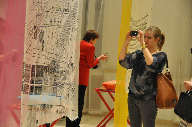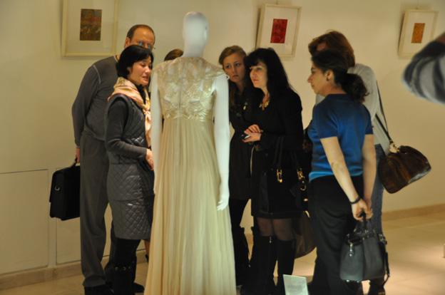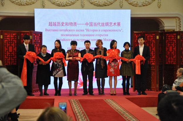 2013年12月5日俄罗斯莫斯科当地时间18点30分 “超越历史与物质——中国当代丝绸艺术展”在莫斯科中国文化中心隆重开幕。开幕式酒会上莫斯科中国文化中心主任张中华公参和全俄装饰、造型及民族艺术博物馆馆长季托娃女士作了热情洋溢的致辞并与浙江省文物局李俏副处长、中国丝绸博物馆研究馆员薛雁女士一起共同为展览开幕剪彩。俄中友好协会第一副主席库里科娃女士也出席了开幕式。NE·TIGER服装有限公司精彩的华装动态秀更将开幕式气氛引向了高潮。被邀参加开幕式的众多嘉宾对来自浙江的中国丝绸博物馆收藏的46件/组展品产生了浓烈的兴趣,对这些精美的当代丝绸作品、服装以及其工艺赞叹不已。在刺绣表演现场,嘉宾们驻足观看、仔细询问,赞不绝口。多家新闻媒体纷纷采访、拍摄报道,在报纸、电视上作宣传推广并给予高度评价。人民画报《中国》杂志、人民日报?人民网等也对展览设计师郑巨欣教授进行了现场采访并作报道。俄罗斯服装设计大师,法国文学艺术骑士勋章获得者瓦连京·尤达什金团队代表6人也于12月4日出席了预展仪式,并与中国丝绸博物馆专业人员就相关专业问题进行了友好的交流。
