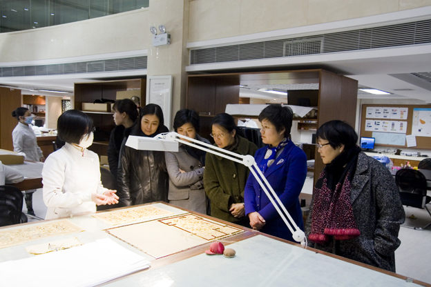 3月4日下午1点,由中共苏州市委常委、宣传部长蔡丽新率领的苏州市考察团一行8人前来中国丝绸博物馆考察。我馆党支部副书记、馆长助理蔡琴全程陪同来宾参观博物馆基础陈列,在介绍每个展厅陈列的丝绸文化历史和丝绸工艺之外,蔡琴书记还着重介绍中丝博近年来的在收藏、展示和科研方面的特色发展。尤其在“天蚕灵机—中国蚕桑丝织技艺非物质文化遗产展”展厅和纺织品文物修复展示馆,博物馆的活态展示获得了来宾的频频赞许。