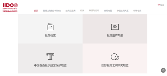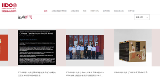 经中共浙江省委宣传部批复,中国丝绸博物馆于2019年6月正式成立“国际丝绸之路与跨文化交流研究中心”(以下简称“国际丝路中心”)。国际丝路中心(Institute for Intercultural Dialogue on the Silk Roads,简称IIDOS,https://iidos.cn/iidos)网站已于2021年6月上线。国际丝路中心涵盖六大版块,其中丝绸之路数字博物馆、丝绸之路周、 档案版块(丝绸之路项目数字档案、丝绸之路文化遗产年报)、联盟与论坛(国际丝路之绸研究联盟、中国蚕桑丝织技艺保护联盟、馆长论坛、策展人研修班)等子版块已于2021年上线;世界丝绸互动地图、中国丝绸大系等子版块还在建设中,近年内将呈现于众。国际丝路中心以丝绸之路文化遗产为核心开展研究、保护、传承、弘扬等工作,为国际国内同行特别是丝绸之路沿线国家和地区提供了合作和交流平台。