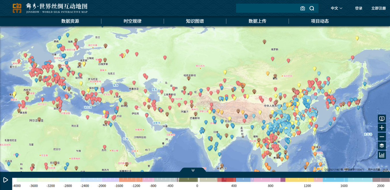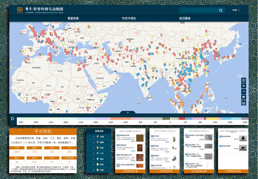世界丝绸互动地图(World Silk Interactive Map,https://iidos.cn/iidos/worldsilkmap)是文化遗产领域首个由中国学者发起并主导、多国参与并实施的国际合作项目。截止到2021年底,已有欧洲14家、亚洲12家、美洲2家、非洲2家共计30个机构的学者共同参与。该项目立足全球视野,聚焦世界丝绸遗产,是由中国学者和学术机构牵头国际学术同行组织实施资源调查、技术研发和示范应用,探寻世界丝绸起源、传播与交流的时空规律,建成世界丝绸互动地图的应用平台,旨在完善世界丝绸遗产框架,加强丝绸遗产的认知,推动传播和弘扬丝绸之路精神。项目最终搭建一个“锦秀·世界丝绸互动地图平台”门户网站,可提供数据资源管理、时空可视化、知识图谱三大模块。