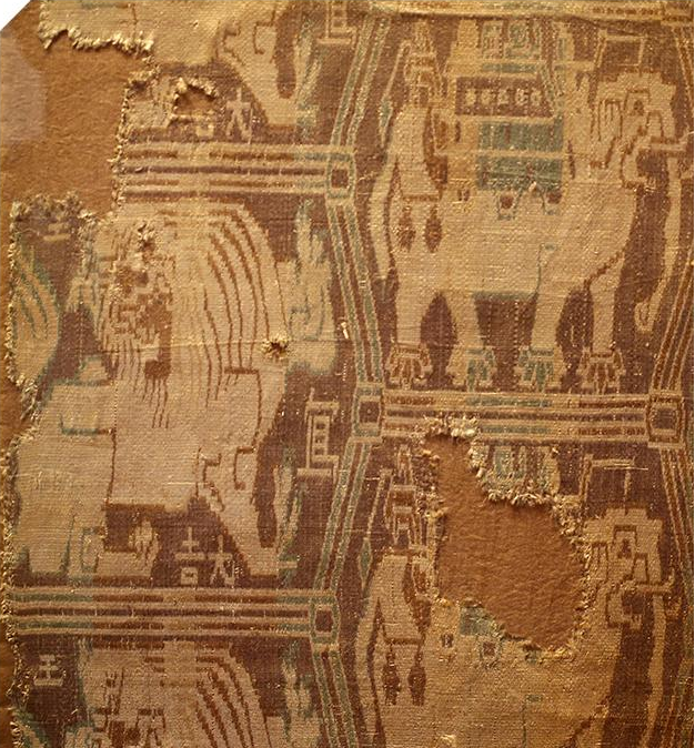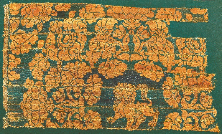 外邦进贡的狮子在进入中原后,被养在皇家苑囿中,除了皇族和宫廷近臣见过这些身披金毛的猛兽外,对中国的普通百姓而言,狮子一直是个传说,但这并不妨碍它作为一种吉祥图像出现在各类器物中。具体到纺织品中出现狮子造型,则早在汉晋南北朝时期。新疆尉犁营盘墓地M15曾出土一块狮纹栽绒地毯,覆盖在棺木之上,年代大概在东汉中晚期,其主体图案是一只伏卧的雄狮,前足伸直,后足曲蹲,狮头侧视,具有明显的外来艺术风格特征。营盘地处丝绸之路“楼兰道”的要冲,结合其他随葬品,特别是墓主人身穿罽袍具有浓厚的希腊化艺术风格,考古人员推测墓主人是一位来自西方、从事贸易的富商,而这块栽绒地毯,本身可能就是一件舶来品。