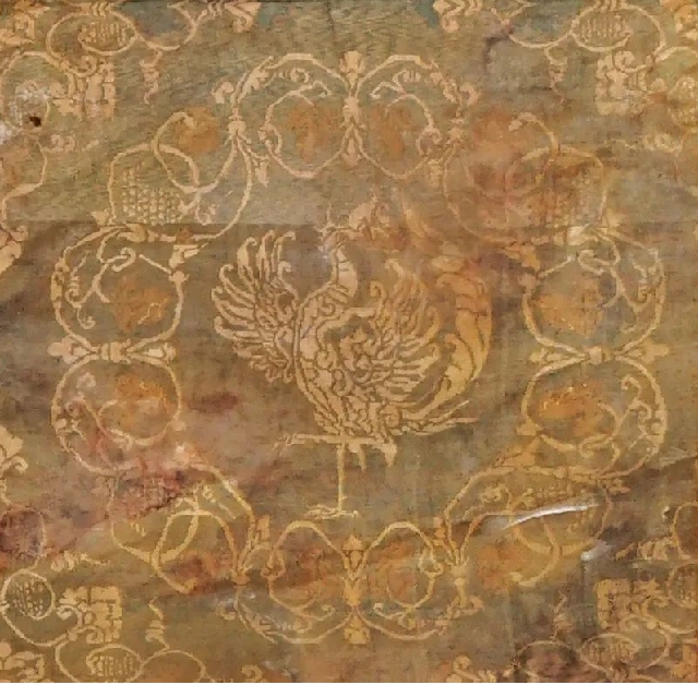 绿地缠枝葡萄团窠立凤锦,天授二年(691)甘肃天祝慕容智墓出土