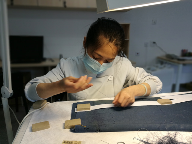 修复时采用整体衬垫并结合嵌补的方式,补全加固破损部位。嵌补采用与文物面料相近的毛呢织物作为修复材料,此修复面料为毛纺厂定制所得。加固缝线采用单根丝线与细毛线相结合,沿经纬线走向将嵌补材料与文物及背衬缝合。并对脱落的金属线按原刺绣工艺予以回钉复原,将上衣两袖口的刺绣部位包覆绉丝纱,防止老化的绣线断裂后金属绣片脱落。此项目已于2019年初完成修复。