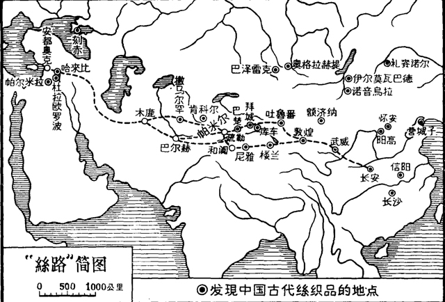 图7.发现中国古代丝织品的地点和“丝路”简图