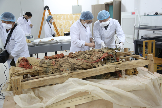 11月19日至20日,纺织品文物保护国家文物局重点科研基地赴新疆,与吐鲁番研究院共同开展吐鲁番胜金店古墓群出土干尸服饰的揭取工作。