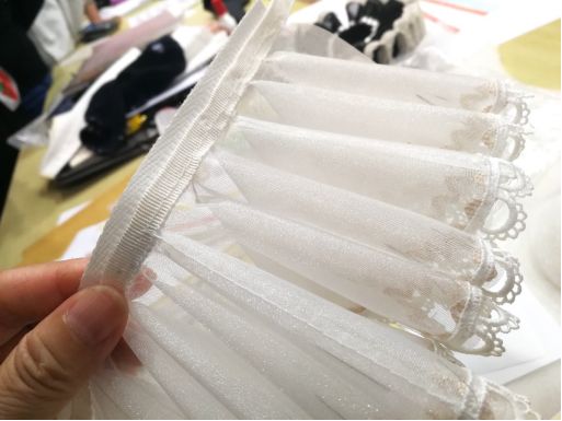 了解了历史背景,大家齐齐动手用白色欧根纱试做一个轮状褶皱领围,传说中的“伊丽莎白圈”。明天要把它完成,然后就要开始缝制一件1880年代晚期版型的束身胸衣啦。