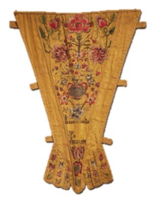 Stomacher:穿在束身胸衣正前方的倒三角形饰片,往往装饰繁复华丽。一位淑女也许只有数量很少的Corset,却可以有很多件Stomacher,每次换衣服的时候只要换前胸的饰片,就能给人好像有很多件很贵的衣服一样的效果。