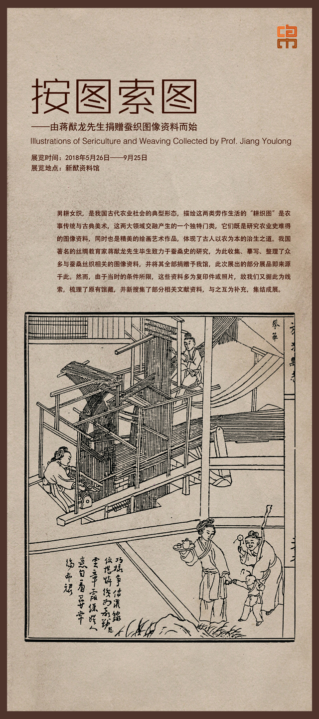男耕女织,是我国古代农业社会的典型形态,描绘这两类劳作生活的“耕织图”是农事传统与古典美术,这两大领域交融产生的一个独特门类,它们既是研究农业史难得的图像资料,同时也是精美的绘画艺术作品,体现了古人以农为本的治生之道。我国著名的丝绸教育家蒋猷龙先生毕生致力于蚕桑史的研究,为此收集、摹写、整理了众多与蚕桑丝织相关的图像资料,并将其全部捐赠予我馆,此次展出的部分展品即来源于此。然而,由于当时的条件所限,这些资料多为复印件或照片,故我们又据此为线索,梳理了原有馆藏,并新搜集了部分相关文献资料,与之互为补充,集结成展。