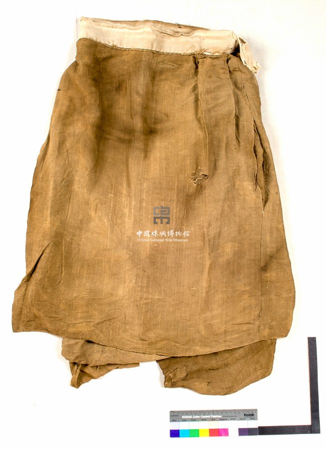形状内容描述 此件裙子已作过初步修复,裙呈筒状,前后片均有部分位置交叠,裙子采用平纹绢织物制成,尚留有一边裙腰,以白色棉布制成。