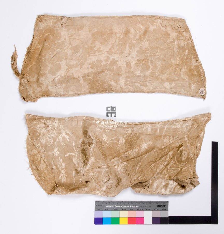 形状内容描述 此件袜套共有一对,呈直筒形,其基础组织为五枚经缎地上起五枚纬缎花,其主题纹样为折枝牡丹花及蝴蝶图案。