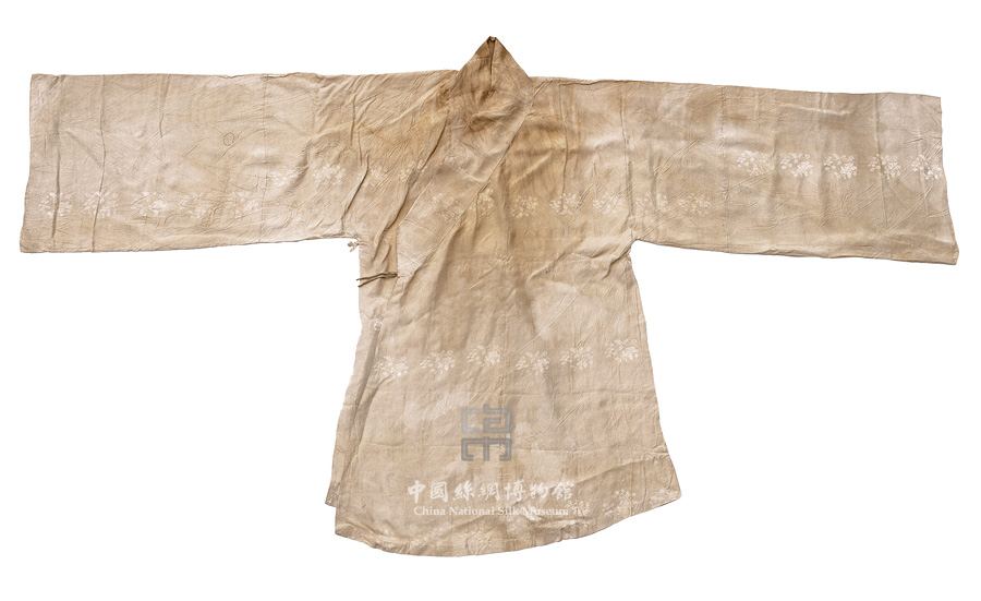 文物简介:1990年出土于江西九江荷叶墩万黄氏墓。该衣为右衽斜襟交领,胸围50cm,袖口37.5cm,下摆69cm,单衣面料织物为1:1平纹地上起四枚斜纹花,属平纹地暗花织物——绮织物。图案为横向排列的折枝花卉,每行之间的折枝花卉间隔29.5cm,图案经向循环为34.5cm,纬向循环为9.5cm。