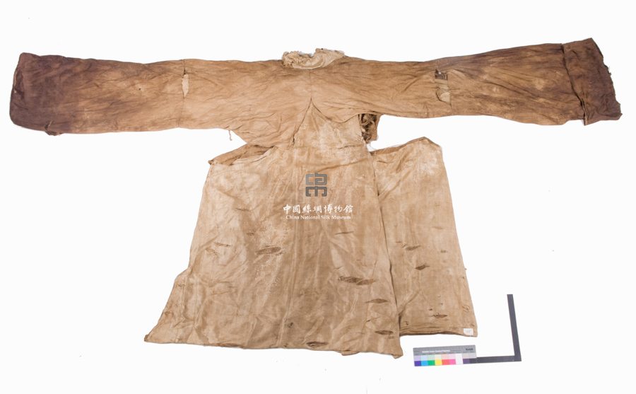 形状内容描述 此件衣服正身及袖子等有多处破裂,右衽、斜襟、窄袖、宽下摆。整件衣服以同向暗花绫制成,其地组织为2/1左斜纹,花组织为1/5左斜纹,主体图案为曲水纹地四合如意云纹,里子使用黄色素绢制成。